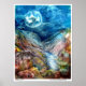 High from a cliff top, the view of the moon on a river far below is decorated by signs from the many who have travelled there. Poster,print.