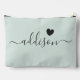 Cet élégant sac à accessoires est orné d'un élégant arrière - plan à la menthe pâle orné d'une police de caractères moderne affichant un nom personnalisé et un design de coeur charmant. La couleur douce, féminine et la typographie sophistiquée en font un accessoire parfait pour les demoiselles d'honneur ou toute personne qui apprécie les designs chic et tendance. Son utilisation polyvalente et son toucher personnalisé ajoutent un élément spécial à cette belle pièce.