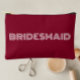Couleur rouge canneberge solide, petit style, sac cosmétique zippé pour votre femme de chambre mariage qui porte le mot, BRIDESMAID en grande typographie moderne sur un côté du sac. Parfait comme un sac d'accessoires de voyage pour tenir le maquillage, le parfum et les bijoux. Vous pouvez personnaliser en ajoutant le nom de la femme de ménage si vous le souhaitez. Disponible dans de nombreuses couleurs de thème mariage de bridesmaid populaires.