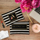 Un cadeau élégant et unique pour elle pour toute occasion. Un cadeau d'anniversaire bien pensé, un cadeau de Noël chic ou un cadeau de jour de mère élégant. Customisez la typographie sur le dos et transformez-la en une pochette élégante pour accessoires pour vos cosmétiques, crayons et autres fournitures scolaires ou une pochette de comptabilité personnalisée pour tenir des reçus pour vos collègues, enseignants ou demoiselles d'honneur. Exquise disposition florale avec une belle pivoine dans les tons rouges, avec des bourgeons de fleurs plus petits dans le même ton. L'aménagement est de forme simienne et orné de baies pourpres et de feuilles vifs et vert vif. Le nom personnalisé le rend unique ainsi qu'un cadeau parfait personnalisé pour toute fille dont le nom commence par la lettre A. Elégant et moderne noir blanc rayures d'or arrière - plan.