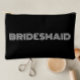 Noir solide, petit style, sac cosmétique zippé pour votre femme de chambre mariage qui porte le mot, BRIDESMAID en grande typographie moderne sur un côté du sac. Parfait comme un sac d'accessoires de voyage pour tenir le maquillage, le parfum et les bijoux. Vous pouvez personnaliser en ajoutant le nom de la femme de ménage si vous le souhaitez. Disponible dans de nombreux modèles de couleurs mariages de demoiselles d'honneur populaires.