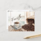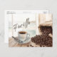 A charming watercolor postcard featuring a cozy scene of a traditional pocillo—a small cup of coffee—resting on a rustic wooden table. Next to it, a burlap bag of freshly roasted coffee beans spills open, their rich aroma almost palpable. In the background, the soft hues of a peaceful beach view, with gentle waves and a bright blue sky, create a serene tropical atmosphere. The blend of the warm coffee scene and the calming seaside setting evokes a perfect moment of relaxation and Puerto Rican charm.