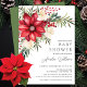This elegant winter holiday baby shower invitation features gorgeous red poinsettia flowers with greenery. The invitation is perfect for celebrating the upcoming mom to be during the holiday season. The front of the invitation features the red poinsettia flowers and greenery, along with the name, date, time, and location of the shower. The overall design is festive and sophisticated, and the invitation is sure to impress your guests.