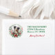 On this Holiday return address label, an adorable blue merle Australian Shepherd puppy is framed within a green Christmas wreath. A red poinsettia blossom is at the bottom. Your custom text is in green at the right, with a text field for a greeting in red below.