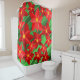 This shower curtain has a Christmas design of poinsettias scattered around on a field of green stripes.