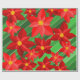 This wrapping paper has a Christmas design of poinsettias scattered around on a field of green stripes.