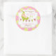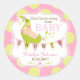 Petite fille qui dort mignonne dans un pod de pois avec banderole de baby shower et un arrière - plan pois-pois rose et vert merci étiquette autocollant.