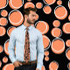 Cette cravate cool, funky et arty présente un motif de grands et petits pois coralliens avec des anneaux blancs décalés sur le noir.