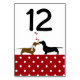 Carte de numéro de table de mariage à thème Dachshund faite en blanc, sur le dessus et un rouge avec pois blancs, sur le bas de la carte. Des graphiques mignons d'un brun et d'un dachshund noir baiser décorent la carte, sous le numéro noir gras. Personnalisez le numéro de chaque table à la réception. Excellent avec nos produits Mariages Pois et Dachshunds correspondants.