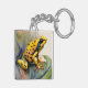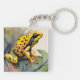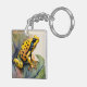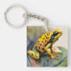 Keychain features amphibian watercolor portrait of a black and yellow poison dart frog on a leaf.