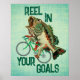 Poisson basse à grande bouche à bicyclette sur une affiche verte qui dit "Reel In Your Buts"