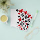Grey, textured background with polygonal playing cards symbols. Symbols of playing cards, heart, diamond, spade and club.