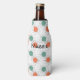 This bottle cooler has a mid-century modern design of circles with lines behind in orange and green.