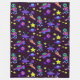 Une jolie scène spatiale remplie d'étoiles jaunes, de planètes colorées et de personnages adorables. Un alien vert avec des chaussures à fusée, une fleur alien dans un pot à fleurs, une voiture-fusée futuriste rétro avec une dame et son chat, et une soucoupe volante avec un alien heureux qui lui arrache les yeux. Avec MLO, la signature des artistes, cachée sous les planètes.