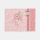 Jolie couverture d'ouatine de bébé, avec un motif rayé de corail et blanc et un motif de corail et blanc de polka de point, le long du dessus. Les graphiques doux d'un ruban cranté de bord avec l'arc, décore le dessus de la couverture et une bannière florale de corail et bleue, décore le milieu. Personnalisez le texte brun avec le nom du bébé. Belle idée de cadeau de bébé.