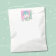Cute pink retro-style Holiday square sticker showing a polar bear cub biting joyfully into a freshly baked Christmas cookie . The text reads "Merry Christmas" but you can change it with your own . It is perfect to seal an envelope or a favour bag . You can also use it to decorate a present packaging . Look into our collection for additional choices of stickers .