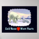 A polar bear cub seeks reassurance from its mother on the arctic ice pack. Text reading "Cold Noses Warm Hearts" and a red heart also appear. All on a starfield background.