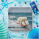 Polar bear surfing on a surfboard with big ocean waves