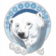 A portrait of a polar bear drawn in an art nouveau style. Snowflakes all around the polar bear against shades of blue backdrop.