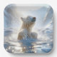 A polar bear joyfully splashes in icy water, surrounded by sunlight and snow-covered mountains