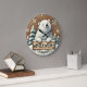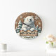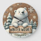 This cute, friendly clock features a smiling polar bear leaning over a wooden sign that reads "WINTER WISHES". The background is a rustic brown wood panel with falling snowflakes, and the scene is set with two snow-covered pine trees. The design creates a cheerful and cozy winter atmosphere. The design may look real due to the high detail and three-dimensional texture in the artwork.