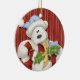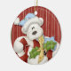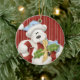 A polar bear with a big red and white candy cane on a red striped background keepsake holiday ornament.