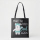 This tote bag features a white polar bear with light blue swim ring and cap to raise awareness about climate change to make the world cool again.