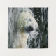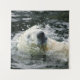 A solitary polar bear gracefully swims through icy waters, its majestic white head breaking the surface with only droplets of water suspended in the crisp air.