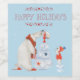 Whimsical Christmas scene features big and little polar bears decorating their tree. Watercolor illustration on light blue background with red hand drawn "Happy Holidays" message