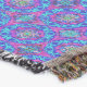 A vibrant pattern of circular motifs is arranged in a symmetrical grid against a blue background. Each motif consists of intricate, colourful details, forming a kaleidoscopic effect with harmonious repetition.