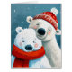 This image features two polar bears in a heartwarming embrace, set against a snowy, teal-toned background. The larger bear wears a red knit hat, decorated with subtle patterns, while the smaller bear is wrapped in a bright red scarf. Both bears have soft, rosy cheeks and serene expressions, creating a cozy and affectionate winter atmosphere. The textured, painterly style enhances the warmth and charm of the scene.