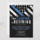 This design features a police force flag with black and white stripes, and a thin blue line stripe as well. "The Legend is Retiring" text sits above all of the party details for the retiring law enforcement officer, sheriff, captain, or chiefs retirement party details.