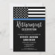 This design features a police force flag with black and white stripes, and a thin blue line stripe as well. "Retirement Celebration" sits above all of the party details for the retiring law enforcement officer, sheriff, captain, or chiefs retirement celebration.