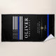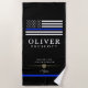 A custom police officer anniversary-themed tall black beach towel tailored to law enforcement. The thin blue line and police flag is representative of American Police and personnel.