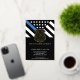 This design features a police force flag with black and white stripes, and a thin blue line stripe as well. The police badge and gold text sits above all of the party details for the retiring law enforcement officer, sheriff, captain, or chiefs retirement party details.