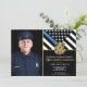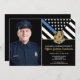 This design features a police force flag with black and white stripes, and a thin blue line stripe as well. The police badge and gold text sits above all of the party details for the retiring law enforcement officer, sheriff, captain, or chiefs retirement party details. Customize this design even further with the photo of the retiring police officer.