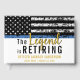 This design features a police force flag with black and white stripes, and a thin blue line stripe as well. "The Legend is Retiring" text sits above the customizable name of the retiring law enforcement officer, sheriff, captain, or chief. Celebrate this milestone in style!