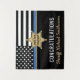 This design features a police force flag with black and white stripes, and a thin blue line stripe as well. Customize with the name of the retiring or graduating law enforcement officer, sheriff, captain, or chief. A great way to say congratulations to the new retiree or graduate for their retirement or graduation from police academy.