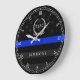 A wall clock featuring a thin blue line American flag symbolic of law-enforcement. Roman numerals and a spot for yours or your gift recipient's badge number and last name.