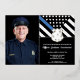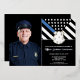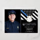 This design features a police force flag with black and white stripes, and a thin blue line stripe as well. The police badge and gold text sits above all of the party details for the retiring law enforcement officer, sheriff, captain, or chiefs retirement party details. Customize this design even further with the photo of the retiring police officer.
