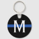 This police thin blue line key chain has a horizontal blue stripe on a black background and a monogram initial in white for you to personalize.