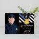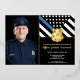 This design features a police force flag with black and white stripes, and a thin blue line stripe as well. The police badge and gold text sits above all of the party details for the retiring law enforcement officer, sheriff, captain, or chiefs retirement party details. Customize this design even further with the photo of the retiring police officer.