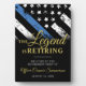 This design features a police force flag with black and white stripes, and a thin blue line stripe as well. "The Legend is Retiring" text sits above all of the party details for the retiring law enforcement officer, sheriff, captain, or chiefs retirement party details.