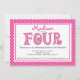Commencez votre 4ème anniversaire avec notre adorable invitation à la fête de quatrième anniversaire de l'alphabet rose pois sucré des filles. Notre mignonne invitation à l'anniversaire de la fille comporte le mot "quatre" dans un motif à points de polka rose et blanc chaud placé sur un arrière - plan blanc avec un cadre de bordure pointillé rose & blanc.