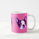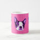 Perk up your morning with a purple Boston Terrier puppy head on a pink polka dot background!