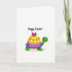 This greeting card features a friendly green turtle-like character centered along the lower half of a white background, smiling with big, gentle eyes that give it an affectionate, companionable look. Its rounded shell is styled like a tiered celebration display, suggesting a sweet shared moment rather than a solo pose. The top tier is sunny yellow with small white dots and tiny pink tulip-shaped flowers, followed by a bright pink middle tier with matching white dots. The bottom tier is purple with neat white ring patterns, and a large fuchsia bow sits on top like a gift-ready accent. Near the top of the card, the words “Happy Easter!” appear in a flowing, casual style in a dark tone, centered above the character. A few spring touches, like 🌷-shaped blossoms on the shell, add a soft seasonal cue, and a small 🐰 or 🐇 emoji would fit naturally beside the greeting. The white space around the turtle keeps the focus on the stacked shell colors and the bright bow, with the pink flowers and white dot details clearly visible.