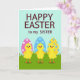 Designed with a pale blue background, this Easter card opens with deep crimson text across the top that reads “HAPPY EASTER to my SISTER,” with the first words larger and the rest tucked neatly beneath. Below the lettering, three small yellow baby birds stand side by side, their tiny orange beaks and feet turned slightly toward one another as if sharing a friendly moment. Each bird has a simple dark eye and a soft, content look that adds a gentle, caring tone to the scene. Behind them sit three large egg shapes like seasonal decorations, arranged in a row to frame the birds. The left egg is pink with white polka dots, the middle egg is light blue with darker blue dots, and the right egg is yellow with light blue spots, keeping a cheerful pattern throughout 🌷. Along the bottom, a wavy strip of rich green grass anchors the birds and eggs like a small spring meadow 🐰. The eggs rise above the grass in smooth ovals, with evenly spaced dots that echo across all three colours.