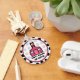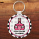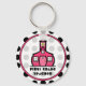 A keychain featuring a black and white polka dot background. Logo of Pink Schoolhouse inside a hot pink frame. Customizable text reads "First Grade Teacher"