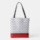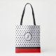 Black and white polka dot tote bag with your initial. The bottom border is a red and black stripe to contrast the polka dot design. Classic carry all.