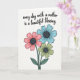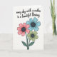 This card features a digital illustration of three stylized flowers arranged from the lower left on a bright white background, with a gentle, affectionate mood ❤️. The blooms lean slightly toward one another like close friends, creating a cozy little cluster that feels quietly caring. One flower is coral pink, one is soft sky blue, and one is muted sage green, each outlined with dark lines that keep the shapes crisp and easy to read. In the center of every blossom sits a deep charcoal-gray circle with a small white spiral detail that adds a tender, intimate touch. Thin stems and deep forest-green leaves stretch upward, giving the bouquet a calm, grounded look. Above the flowers, the message “every day with a mother is a beautiful blessing” appears centered in black lettering, spaced comfortably so it feels airy and open 🌼. The text sits in the upper half of the layout while the bouquet stays anchored in the lower left, and the petals show dark centers with white spiral marks.